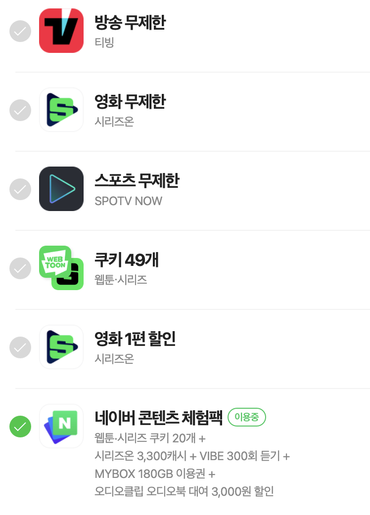 네이버플러스 멤버쉽을 이용한다면 티빙 무제한 이용이 가능하다. 멤버쉽을 가입하면 아래 혜택중에 선택할 수 있는데, 한달에 한번만 선택할 수 있고, 미리 다음달 혜택을 선택해놓을 수 있다. 멤버쉽 혜택을 사용하지 않고 있었는데, CJ 계열의 타 플랫폼에서 볼 수 없는 프로그램이 티빙에 많기 때문에 티빙 방송 무제한으로 선택할 계획이다. 아무튼 네이버 멤버쉽이 4,900원이니 네이버에서 쇼핑을 자주한다면 가성비 좋은 구독료.
