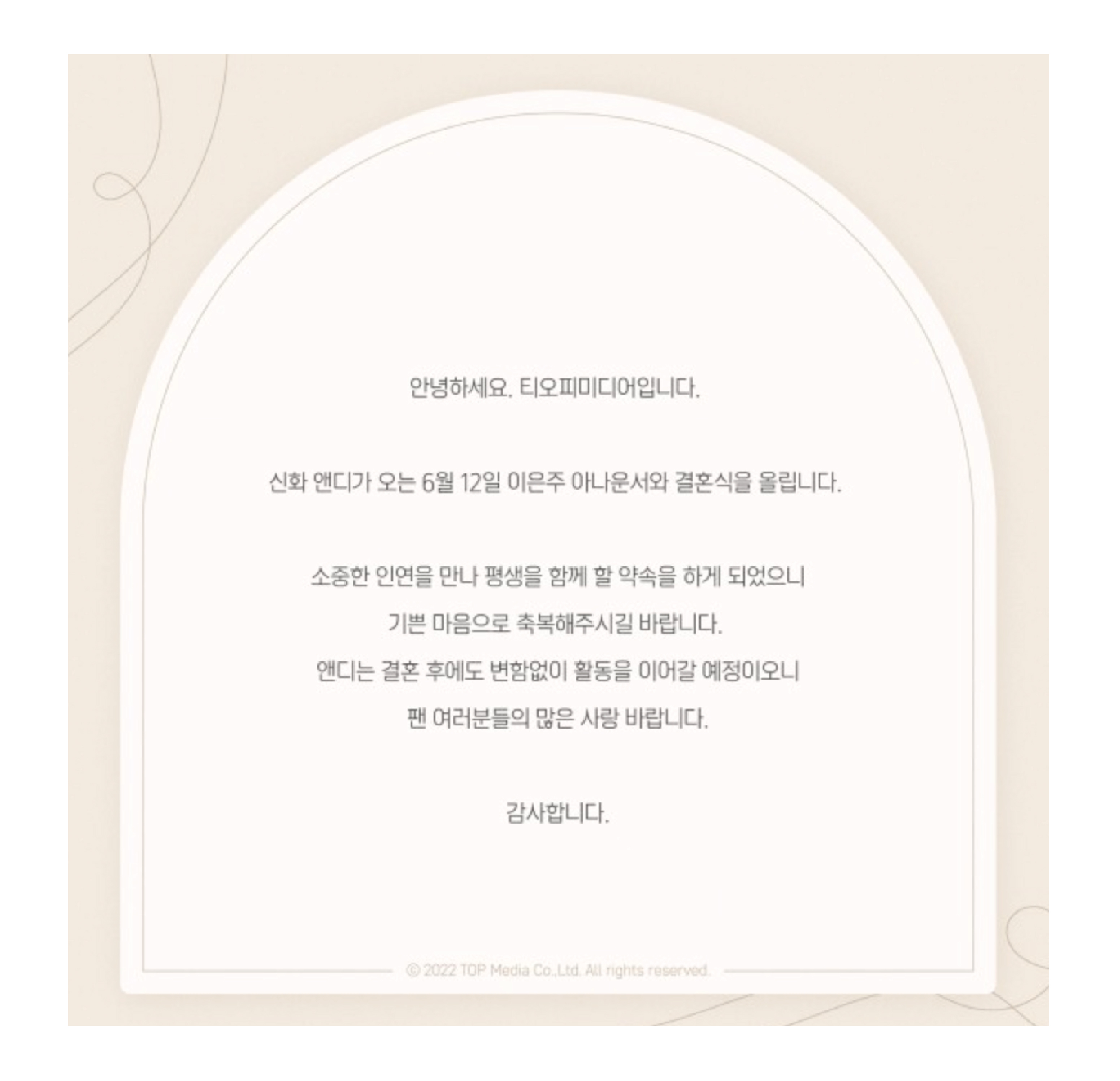 앤디는 "결혼 후에도 변함없이 활동을 이어갈 예정이고 팬 여러분들의 많은 사랑 바란다"고 얘기했다.