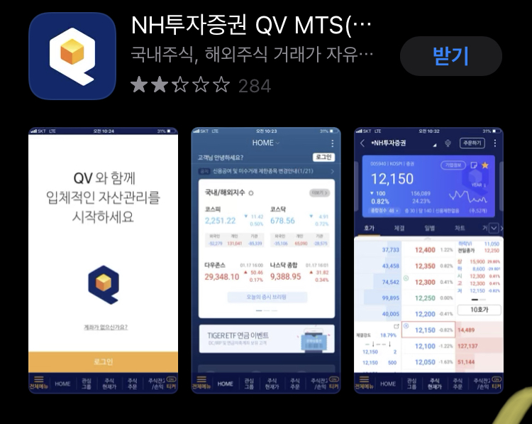 - MTS 활용 - 주식 거래를 위한 어플리케이션. 앱스토어나 플레이스토어에서 다운받고 공동인증서를 등록해서 사용하면 된다. 주식 매매는 물론, 보유 주식내역확인 및 입출금 환전 등 증권업무의 전반적인 내용들을 확인할 수 있음은 물론이고 기업 분석 내용과 경제 뉴스, 인공지능이 추천하는 유망 종목 등 여러가지 정보도 상당한 편이다. 스토어에서 MTS를 검색하면 많이 나오니 비교해보고 사용해볼 것.