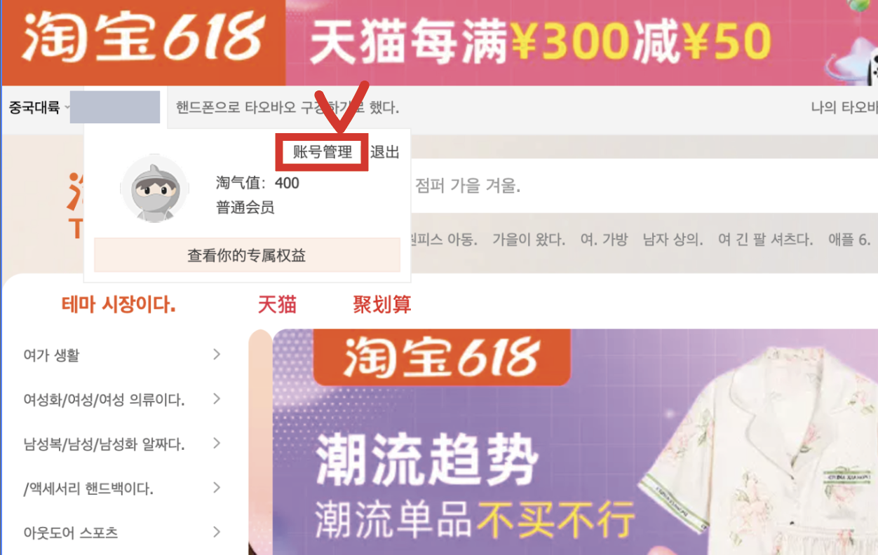 - 자신의 아이디에 계정관리를 누른다. (한글 버전으로 번역을 해도 팝업은 번역이 안되기 때문에 중국어 위치를 확인하고 클릭한다.)