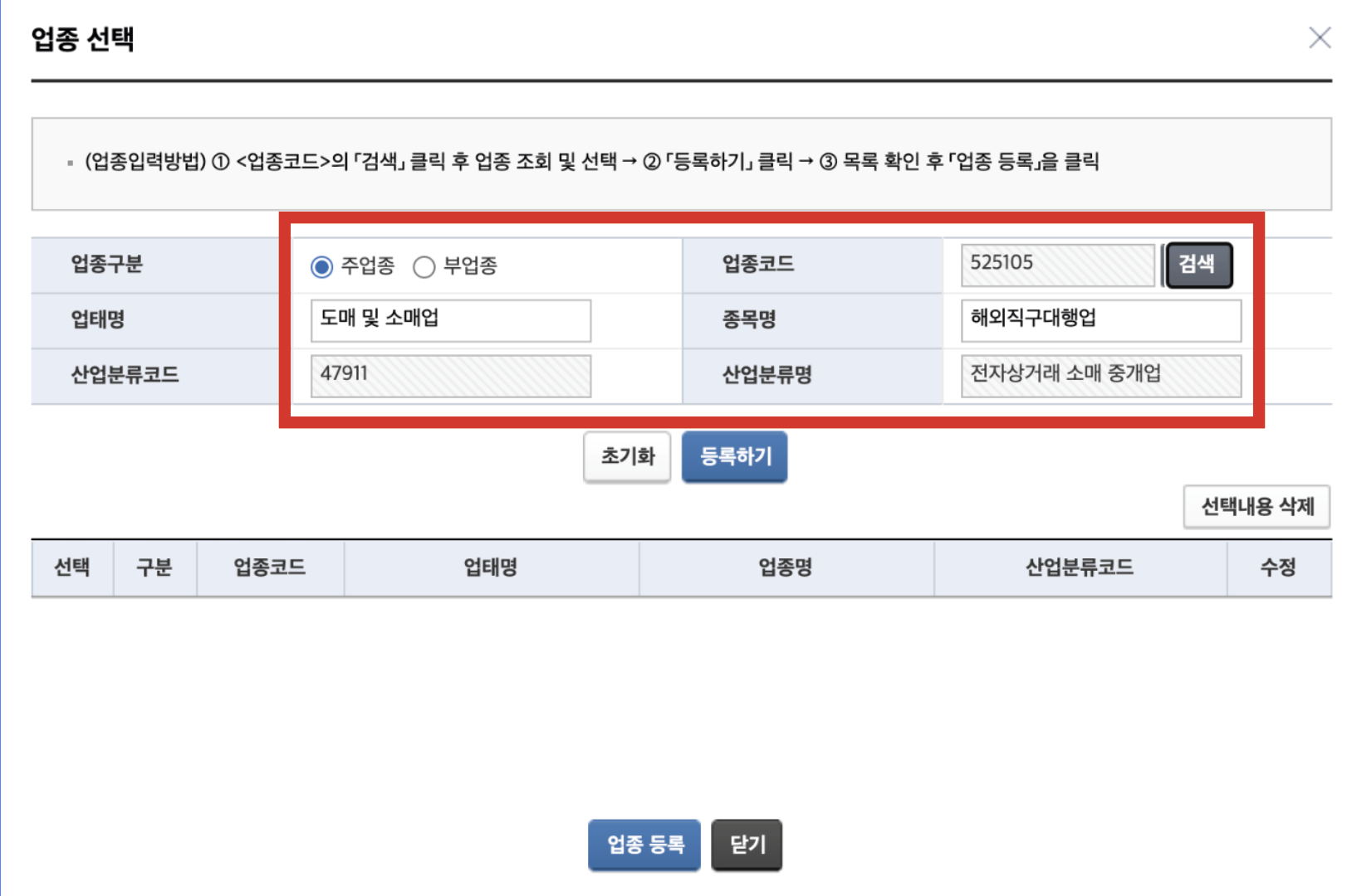 위와 똑같은 방법으로 부업종도 선택한다. 똑같이 검색해서 업종코드 525101 검색 후 산업분류코드 47912 전자상거래 소매업 선택하면 된다. 그래서 결과적으로 아래와 같은 주업종과 부업종을 선택하면 해외직구 구매대행업 사업자등록 완료.