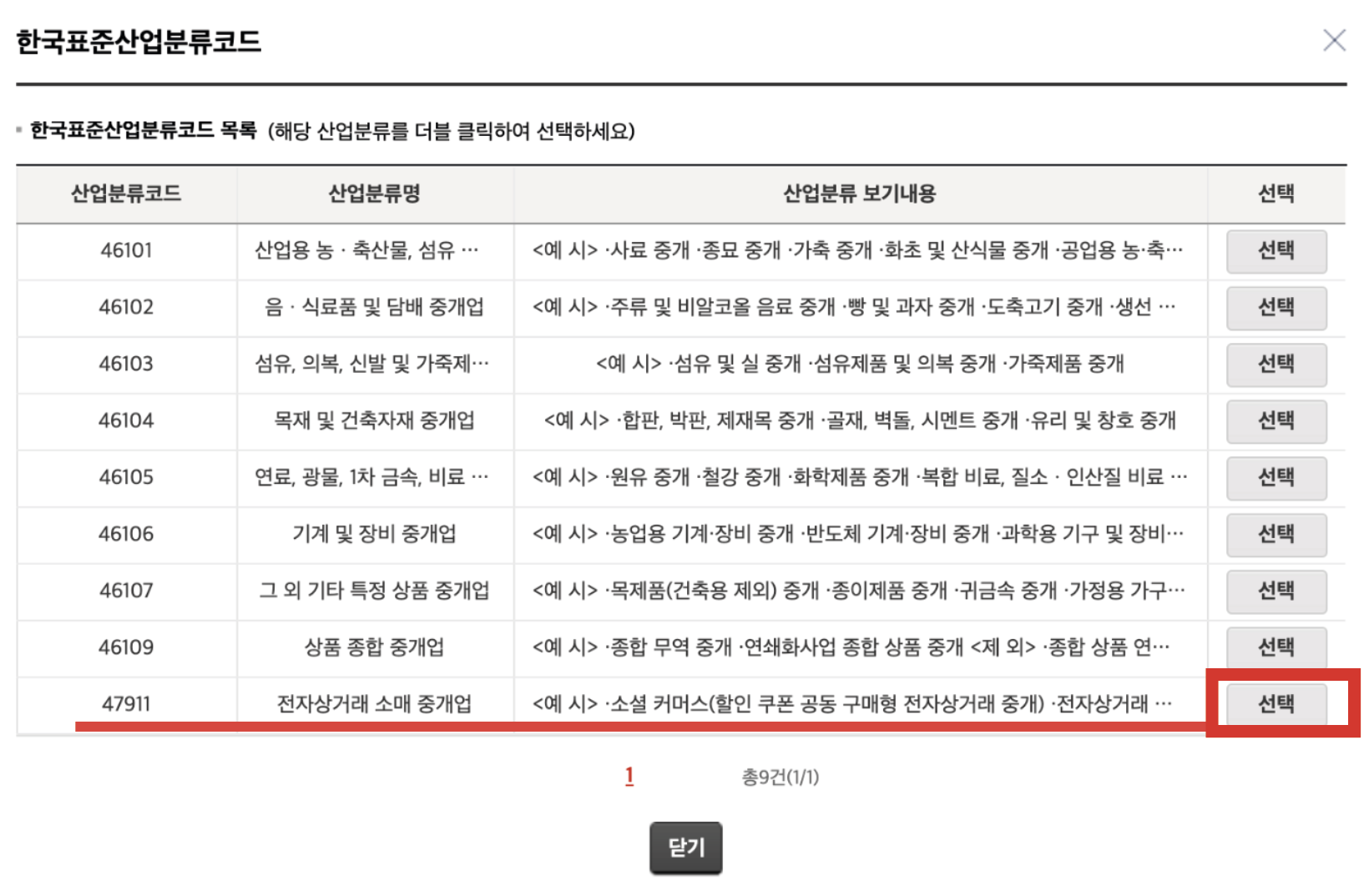 맨 아래에 있는 산업분류코드 47911 선택.